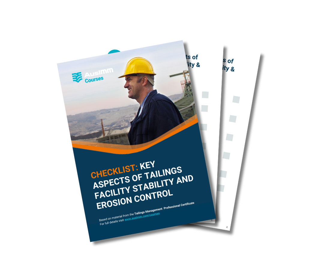 This free checklist, Key Aspects of Tailings Facility Stability & Erosion Control, serves as a practical guide for managing and maintaining secure tailings storage facilities. Based on material from the AusIMM Tailings Management Professional Certificate.